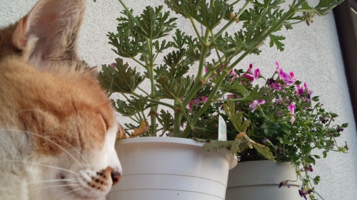 日曜も暮れようとしていますが・・先週の日曜が母の日で、主婦休業したせいでしょうか?すっかり癖になって今日も休業です。なんだかエネルギーが湧いてこないんですよそんなときは「花だ。花を買いに行こう」いつものパターンで行きました・・・野菜の苗は、モロヘイヤとオクラ。花の苗は、ゼラニウムとキンギョソウ(紫の葉の)、キキョウを買いました。ゼラニウムを選ぶとき一鉢ずつ手にとって香りを確かめて選んだのですが・・・皆さん、香りでは選ばないですか??売り場を見回したところ鼻をくんくんさせているのは私だけでした。いつも猫と一緒にいるからかな?チビちゃんも嗅ぐよね?? 「うん。このタオル、お花の香りで好き♪」
