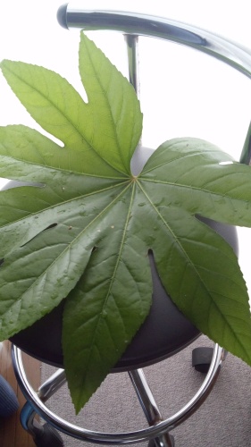 夕べは良い雨が降りました。こちらはお天気が続いて一雨ほしいと思っていたところの雨雨上がりの裏庭で巨大ヤツデを見つけました。ほんとでっかいの。座布団くらいある!「座布団なんて、またまた~。teapotさん、話盛ってない??」という声が聞こえる気がするので証明させてもらいます。ねっ、座布団に違いないでしょ?!話は変わりますがパパが風邪を引きました。先週、東北方面の旅をしたときに引いて帰ってきたんですよ。そのあと義父の入院の件でバタバタしたので長引いていると思います。実は私も「風邪うつったかな?」の状態でパパ、いつも旅行にいくと風邪をお土産に帰ってくるんですよね。そして家族にうつして回るところがパパのママ、すなわち義母から電話がかかってきました。「息子が、息子が・・熱があるって。 病院に連れていって! 点滴もしてもらって!!」業務命令だったので「承知しました」と答えて様子を見にいったんですよ。テレビが点けっぱなしでどこにいるのか捜したら・・・お風呂に入ってましたお風呂に入る元気があるなら大丈夫だろうってことで「病院だけは行きなさいよ」言い置いてきましたけれど…。マザコン親子のお相手は面白くないわぁー ぶー