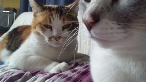 GWも後半ですね。昨日娘が帰省し、なんとなくバタバタしてます。孫娘に会いたがるばあちゃんに会いに行ったり皮膚科の薬が欲しいと言うのでもらいに行ったり。。「やれやれ、お昼寝でも」ソファーに横になったら・・・猫たちが 待ってましたとばかりにお腹の上にお腹の上に乗せたまま撮影しました。お腹を動かさないようにカメラを構えるのは腹筋が要ります(笑)あ、そうそうハーブの苗を買ってきたんですよ!ばあちゃんのケアハウスの近くに産直市場があって花や野菜、苗ものが安いんです。ローズマリーにチャイブ、バジル、イタリアンパセリ・・・こらっ、耳耳、耳どけて!!!