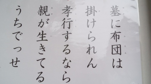 おかげさまで義父の洗濯も一段落しました枕とタオルケット、パジャマの一部。汚れのひどいものは捨てました。敷布団がどうしようかと思いましたがクリーニング代のことを考えると捨てたほうが経済的!かといって新しいものを買うのも・・・なので寺で余ってる布団を使うことにしました。寺から布団を運び出しているとパパが作った標語?お言葉?が目に入ってきました。うちのパパ気に入った言葉をラミネートしてあちこちに貼るんです・・・はいはい。あなたさまの父上に布団をかけて差し上げますよ。父上亡き後の墓掃除はぜひパパにお願いしたい!!!当の父上のほうですが昨日心電図、今日脳波、明日内臓チェック一通りの検査をするため、週末までの入院ってことにしてもらいました。2.3日で帰ってこられると困るじゃないですか!「一日でも長く入院させてください」 とお願いしました。近ごろは1人暮らしのお年寄りが多いので先生も慣れた様子で「本当なら2.3日ですが、ご家族の安心のために1週間」サービスしてくれましたよ病院から帰って庭に出てみるとシランが咲き始めていました・・・あっ、今度は シッポ!!!