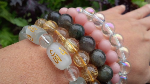 こんにちは~(=゚ω゚)ノご心配いただいた腰痛は だいぶ良くなりました。一応大事をとって力仕事は息子のどちらかを捕まえて頼んでます。「掃除機をかけて」 「お米を運んで」自分でやったら ものの5分で済む仕事。息子が動くまでに数十分。ひどいと数時間かかる! それはもぉー忍耐との闘いです( ̄▽ ̄);ところで昨日知り合いのパワーストーンショップの方が見えてブレスを一つ頂きました♪一つだけだと画的に寂しいので手持ちのブレスと一緒に 身につけてみました・・・さすがに重い。武器になりそう(笑) 一番手前のが頂いたブレスです。刻んだ文字は六字真言といってチベットのお祈りの言葉 「オン・マ・ニ・バ・メ・フン」 を表わしているそうです。災いから身を守る力が強いそうなので興味のある方はチェックしてくださいね。車のダッシュボードに入れて お守りにしている方もいらっしゃいます(*^^)v