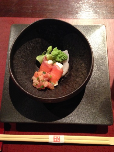 こんばんは(*^_^*) 今日はとても冷たい雨の降る一日でした。夕方からは 風が強くなり、高校生の娘が部活から帰る時が最高潮! 途中のバス停まで 車で迎えに行きました(^_^;) さて、そんな雨の中、仕事を半日であがって、今日は茅ケ崎 湘南ビールにある 和食料理の「天青」に行きました。 10年近くお世話になった、コサージュアトリエのオサワアートの区切りのランチ会でした。 オーナーさんは40年ちょっと、アトリエでお花のお仕事をしてきましたが 昨今の経済事情や、これからやりたいこと(ボランティア)など、色々考えた末に いったん、お花のお仕事に区切りをつけ、これからは地域の方々と手仕事を楽しみ、 集まれるような場所を作って行きたいということで、今日が一区切り。 さみしいですが、これからはお仕事を離れて「仲間」として繋がっていきましょうと 言ってくださいました。 これからの新しいオオサワアートに乾杯! ということで、お料理の数々(*^_^*) まずは先付。サーモンのチーズ巻♪ かかっているトマトのサルサみたいなソースが 酸っぱくて美味♪ 酸味大好きー\(^o^)/ 続いて前菜。ちょっとずつ色んなお料理が盛り付けてあって女性好み♪ お刺身、とろけた~♪ 酒粕のおから、めちゃめちゃコクがある! でも、一番のヒットは ヤーコンの酢の物。ヤーコン、初めて食べましたが、しゃきしゃきしてヤミツキになりそう! 柚子の風味がきいたふろふき大根。あつあつでとろりん♪ あん肝がとける~。 焼き物はイトヨリダイ。脂がのっていてふっくら♪ ここで痛恨のミス! メインを撮影し忘れました(^_^;) 豚肉のシチュー、赤みそ仕立て。とろとろに煮込んでありました(*^_^*) そしてデザートはゆず風味のティラミスとラズベリーのジェラード。 ハーブティーはピーチの香り♪ どれも丁寧に仕上げてあって本当に美味♪ お野菜が美味しくて大満足! お店の雰囲気も落ち着いていていいですよ♪ むかしむかし たけとりのおきなといふもの ありけり・・・ オーナーさん、ごちそうさまでした。そしてお疲れ様でした。ありがとうございました!