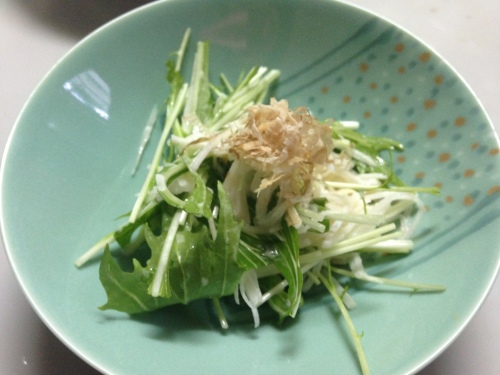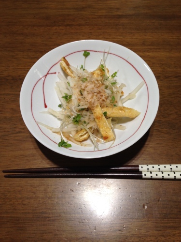 こんばんは(*^_^*) 今夜は驚くほどあったかい神奈川です♪ さて、このところレシピブログばっかり書いているような気が(^_^;) で、今日も懲りずにレシピです(爆) 「あっという間! お揚げと大根のサラダ」です\(^o^)/ ベルナーのスライサーがあればほんの7,8分でできちゃいます(^_^;)実力派の野菜スライサーといえばドイツ・ベルナー社!ベルナー新型Vスライサーです。ベルナー BORNER V5 Vスライサーセット Vpower Vパワー オレンジドイツ・ベルナー社のスライサー専用サーバーボウル(受け皿)です。PL・V5(Vpower)・V4・DL・EL・TLシリーズのスライサーにご使用できます。サラダに便利なストレーナー付です。ベルナー BORNER PL(V5) サーバーボウル(水切りすのこ付) オレンジ【※単品※】 もっとお得に・・・という方におすすめ♪★今がチャンス★ドイツ・ベルナー社!Vスライサーです。家庭用ですが、業務用で使われるほどの実力派です!旧モデルのため、お手頃価格にてご提供です♪【アウトレット・訳あり特価品】【半額50%OFF】【動画】ベルナー BORNER CL VスライサーSPセット(スペシャルセット) オレンジ では、レシピです(#^.^#) 材料(4人分)・・・大根 1/3本 ブロッコリースプラウト 1パック 油揚げ 1枚 お好みの和風ドレッシング 適量 かつおぶし 少々 1 大根の皮を剥き、カットしたらこのように安全ホルダーにセットします。 ※今回、刃は3.5ミリ 千切り刃を使います。 2 サクサクとスライス。千切りがあっという間にできました\(^o^)/ 3 油揚げをフライパンでカリッと焼きます。油はひかないで。 4 焼いている間にブロッコリースプラウトの根っこをカット。 5 油揚げはこれくらいしっかりきつね色がつくまで焼いてください。 食感がよくなり、香ばしくなります(#^.^#) 6 油揚げを細めの短冊切りにします。 7 ここまでできてしまえば、あとは仕上げ♪ 今回はこれを用意しました。 このドレッシング、母の知り合いに頂きましたがとっても美味しいです♪ 8 我が家は時間差ご飯なので、とりあえず1人分。大根とブロッコリースプラウト、 油揚げをボウルに入れてドレッシングを投入。全体をざっくりと混ぜます。 9 器に盛りつけ、かつおぶしをパラリとのせたら出来上がり\(^o^)/ おまけ。今夜の私のご飯。このサラダとかまたまうどん。最近ハマっています♪ お友達にもらったこの玉子かけご飯専用醤油がかまたまうどんに超合う!!!人形町今半 玉子かけご飯醤油 牛すき焼き風★税抜1900円以上で送料無料★人形町今半 玉子かけご飯醤油 牛すき焼き風(210mL)