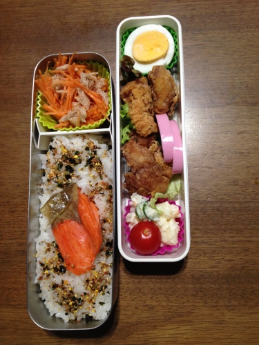 こんにちは(*^_^*) 今日はどんより曇りの神奈川です、太陽、戻ってこーい! 忙しいパパは土日も出勤のことが多いです。土日は昼くらいから出社することが 多いのですが、今日は普段通り朝早く行くみたいだったのでお弁当を作りました。 基本、木曜日の会議デー以外は毎日お弁当です(#^.^#) 今日のお弁当。から揚げ弁当\(^o^)/ からあげはこちらのダシ醤油に一晩漬けたトリもも肉に片栗粉をつけてカラリと揚げました。秋田で知らない人はいない 超有名なめんつゆo(*^▽^*)o【 東北醤油 】キッコーヒメ 万能つゆ 味どうらくの里500ml このつゆ、本当ーーーーーーに美味しい! 煮物やチャーハンにも使っています! 文字通り「万能」\(^o^)/ 人参のツナオイル漬けのレシピはこちら→♪保存が効く! 超簡単 にんじんのツナオイル漬け♪ 人参のツナオイル漬けの他にも、色んなレシピが増えました! クックパッド ユーロキッチンかさいのキッチンもぜひご覧ください(#^.^#)→♪ユーロキッチンかさいのキッチン♪ パパ、今頃お仕事頑張っているかな?