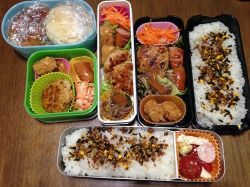 こんにちは(*^_^*) 金曜日ですね~。なぜかほっとする金曜日。 さて、今日のお弁当(気まぐれUP) ・にんじんツナオイル漬け⇒レシピはこちらから♪ ・冷めてもふっくら鶏つくね⇒レシピはこちらから♪ ・肉野菜炒め(オイスターソース味) ・フランクフルト ・ポテトフライ ・ロールパン(ホットドック)・・・ムスメ用 ・白パン(チョコクリームサンド)・・・ムスメ用 今日はこれでご飯が尽きたので私のお昼はセブンイレブンで調達~(^_^;)