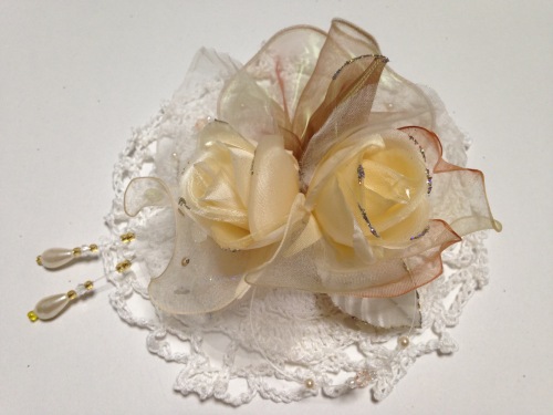 こんにちは(*^_^*) いよいよ3月ですね。雨のスタートですが春はもうすぐ! さて、今日は出品したコサージュを紹介します♪ オオサワアートのアトリエはクローズしていますが、和装の髪飾りを少しずつ 製作しているようです。私は全然行っていませんが、そろそろ顔出ししようかな。 このコサージュは余った材料をいただいて作ってみました。 販売サイトtetoteに出品してみました。ここである程度販売できるようになったら オーナーさんにお話しして販売してみよう…と思いつつなかなかすすみません(^_^;) 焦らずボチボチやってみます。 販売サイトtetoteはコチラからどうぞ♪