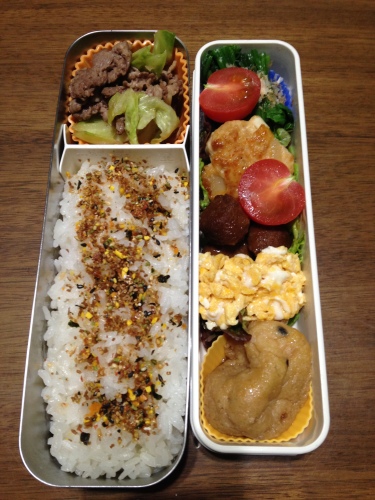 こんばんは! 今日は朝小雪がちらちら舞う寒い一日でした(^_^;) 今日は遅ればせながら、ユーロキッチンかさいの新年会でした\(^o^)/ 社長のご好意で、昼間からステーキやデザートなど、とても美味しいお料理をいただき 幸せ~(#^.^#) ということで、パパのお弁当、少し頑張りました(^_^;) ・牛肉とキャベツの炒め物(焼肉のタレで味付け) ・ほうれん草おひたし ・鶏つくね ・玉子焼き(ダシ醤油味) ・がんもどきの煮物 ・プチトマト 鶏つくね・・・鶏ひき肉(モモとムネを1:1) 卵 玉ねぎ(みじん切り) 塩・こしょう・酒・片栗粉 1、材料を混ぜ合わせる。トロリとするくらいの柔らかさになるように 酒の量を調節する。 2、フライパンにサラダ油をひき、あたためた所にタネをスプーンで すくっておとす。 3、両面をこんがり焼く。 4、醤油とみりんを1:2の割合で小なべに入れ、弱火にかける。 少しだけとろりとするまで煮詰める。これがタレ。 タレをからめて焼き上げてできあがり♪ 自分も働くようになってお弁当を作るようになりました。 こんな感じなんだ~、と自分の作ったお弁当を食べています。 私は職場の電子レンジでチンして食べるので、ほかほかお弁当ですが パパは冷たいお弁当。どうやったら美味しくなるのか日々研究です(^_-)