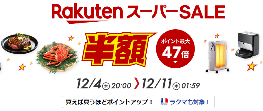 #PR 楽天市場 ブラックフライデー ポイントアップ期間 2025年11月20日(木)20:00~2025年11月27日(木)01:59「年に一度の超還元祭!楽天市場ブラックフライデー2025で最大ポイント爆増チャンス!」2025年の楽天市場ブラックフライデーは、11月20日(木)20:00~11月27日(木)01:59まで開催!家電・ファッション・食品がポイントアップで超お得。限定クーポン配布&ショップ買いまわりで最大ポイント還元を狙おう!楽天市場ブラックフライデー2025|開催期間とポイントアップ概要楽天市場のブラックフライデーは、2025年11月20日(木)20:00からスタート。終了は11月27日(木)01:59までの約1週間。期間中は「ポイント最大44倍」「ショップ買いまわりキャンペーン」「限定クーポン」など、お得が重なる特大セールが実施されます。見逃せない!今年の注目カテゴリー3選家電・ガジェット最新スマホアクセサリーや家電が最大半額。特にAnker・バルミューダ・ダイソン製品は要チェック。ファッション&コスメ人気ブランドの秋冬新作や、美容家電・スキンケアもポイントアップ対象に。食品&日用品お歳暮・年末用のグルメセットや、日常使いのストック品までまとめ買いチャンス。ポイント還元を最大化する3つのテクニック1️⃣ ショップ買いまわりで+9倍を狙う2️⃣ SPU(スーパーポイントアップ)を事前にチェック3️⃣ 限定クーポンを配布開始直後にGETまとめ|2025年の年末買い物は楽天ブラックフライデーで決まり!この1週間は、ポイント還元・セール・クーポンのトリプルチャンス。賢く買って、年末の出費を大幅節約しよう!