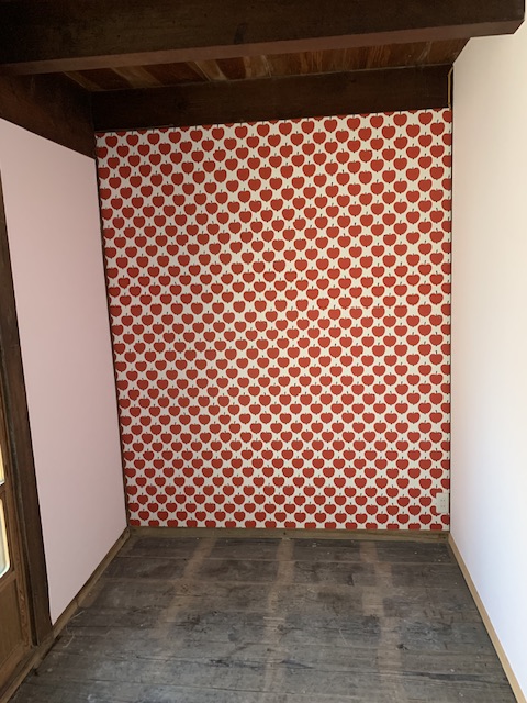 左側、床色を単色でまとめ、右側の壁に花模様を