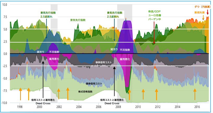 春山さんとこ参考にして、債券の信用コストを2つにしている1)カンサスシティの金融ストレス指数(スプレッド+VIX)2)もう一つはジャンク債スプレッド、BBBスプレッド、TEDスプレッドの混合とした3)これにVIX単独つまりカンサスシティの金融ストレス指数からVIX単独を差し引いたものが、チャートでわかるが、更新は1月単位。これでは遅いので、これは確認用補強に3つの債券スプレッドを1日単位で表現するようにした。問題点はFEDではBoAのデータを使用するあたり、BoAとの申し合わせにより1週間遅れでしか公表できないこと。これはFEDの景気先行指数に言えることで、構成要素のISM、住宅許可などのデータも遅れてしまうので、これについては個別に見て、景気先行指数の値を自分で考えておく必要がある。構成要素の一つである新規失業者については、チャートに示しておくことにした。これが仕事だったら大変だけど、こっちはただのアマチュア本業も結構大変な仕事なんで、そのうえ土日も休まないのが習慣となってるなあ米国で遺伝子の研究してた時も、、、同じだったので、性分なんでしょうね。冬は夜明け前から米国でも仕事へだった。今は孫がいるのに、、同じ