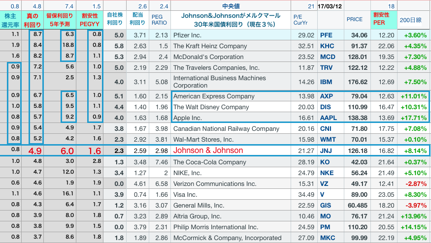個別株の分析はこんな感じで鉄板のJNJをメルクマールに