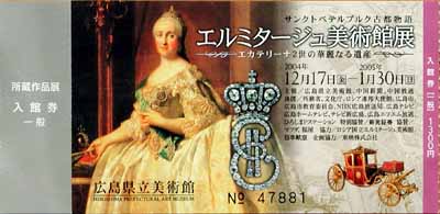 エルミタージュ美術館展を観にいった。広島展は1月30日(日)まで。 平日、広島の展覧会でこれほど混んでいるのは、初めてだった。それほど注目を集めたということか。そう言えば、エルミタージュ美術館の分館を広島へ誘致する話があったが、たぶん資金難で最近は音沙汰ない。 18世紀ロシア、ロマノフ朝の女帝、エカテリーナ2世を中心に据えて、首都サンクトペテルブルクに集積された美術のエッセンスを紹介している。ひとの頭越しに背伸びするとか、精緻な作品のあちこちを見るとかで、すっかり疲れた。オバサングループが3時間かかったと話していたけど、行列に忠実に従ってノロノロ移動していたらそれくらいかかるかも。その執念に敬意! とにかく、王侯貴族の人物像とか、首都の風景とか、外交儀式とかを、油彩、エッチング、織物、大理石、陶磁器などを使って克明に表現する技術、忍耐、時間、資金には脱帽する。頭がクラクラした(あるいは強くない視力のせい?) エカテリーナ2世はドイツ貴族の娘だという。夫ピョートル3世を追放して女帝に。そして寵臣(男)が13人?もいたというから、そっちの手腕もたいしたもの。しかも最後の寵臣は40歳年下だった?と知り、呆然とする。ちなみに女帝は67歳で亡くなった。 その寵臣たちの肖像がずらっと並ぶ。つい、女帝の好みなんか考えてしまう。それに、200年以上前の寵臣たちの顔が分かることは驚異だ。日本では、大奥の側室たちがいかほどの美人であったかさっぱり分からない。それを描き残す絵師はいなかったのかなぁ~入館券広島県立美術館の裏は縮景園まだ春の萌しは感じられない