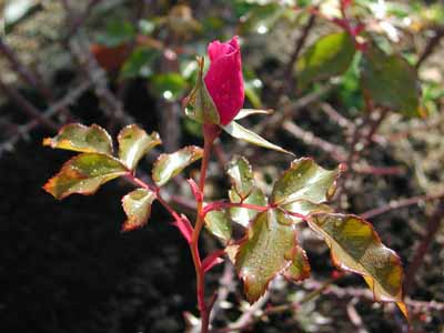 バラを始めて3年目に入った。どの植物でも同じと思うけれど、ほんの駆け出しだ。 この冬は12月下旬まで暖かかったが、そのあとはじゅうぶんに寒いと思う。しかし、バラはかならずしもそう考えていないらしい。待てど、全部の葉を落としてくれない。 休眠期に入ったら、寒肥を与え、剪定をして樹形を整え、黒点病を防ぐため石灰硫黄合剤を噴霧することと、テレビ「趣味の園芸」は言う。まだ暖冬だったころ、テレビの解説者も冬の手入れをどうするか考えているところと漏らしていたから、こちらも「まあ、様子を見ようや」ですんだ。 そうこうするうちに、太陽は次第に明るくなり、バラは芽を出してきた。困ったね・・おまけに、「プレイガール」は蕾までつけた=写真。 切り花にしても、わが家の室温ではまず咲かない。そろそろ決断をしなくては~1月、蕾をつけたプレイガールプレイガールの花