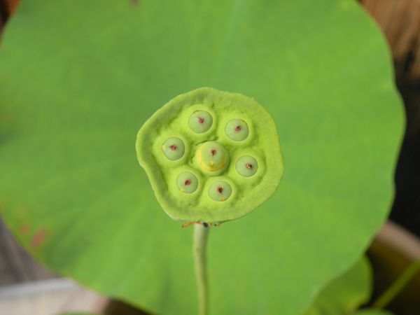 「茶碗ハス」の果実です。ハスの果実をしげしげと眺めるのは今回が初めて。大型の食用ハスでも果実の目玉は7個だったかな?