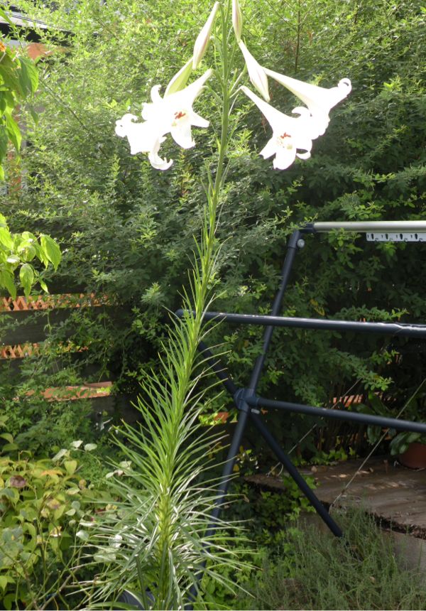 タカサゴユリは我が家で最後のユリ。草の原っぱに一輪ずつ咲いているのはけっこう可愛いが、こんなに巨大になると違和感が強い。巨大になったのは、バラのそばに生えて肥料がたっぷりだったからか。