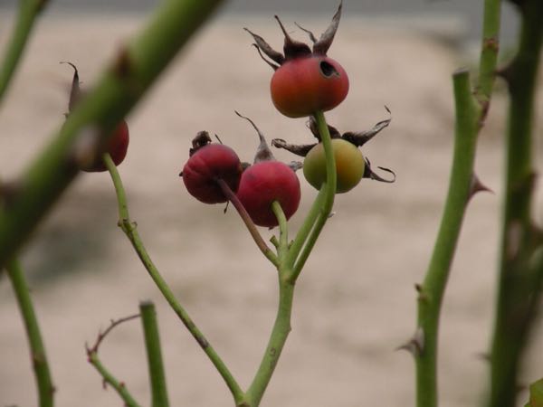 バラの花殻は切り取り、実を成らせないのが常道だが、ここは手が届かないので、実が成ってしまう。バラはエバーゴールド。時々可愛い果実になる。