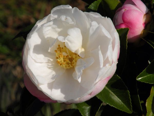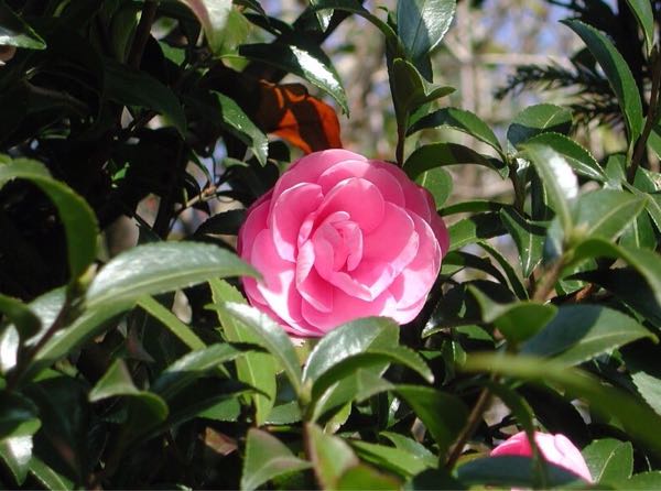 サザンカとツバキの区別は私にとって難物の一つ。いろいろな園芸品種があるからである。よく言われる『花がばらばらに散ればサザンカ』は、花の咲き始めには使えない。写真は乙女椿のつもりだったけど、今頃の開花時期と葉からサザンカ?