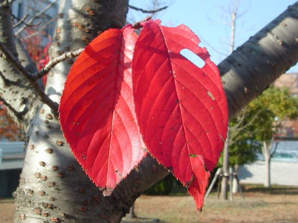 桜も冬支度だが、赤い二枚の葉っぱが散らずに残った。