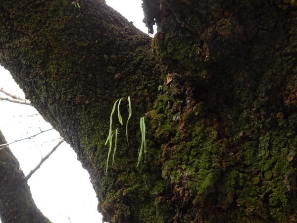 ノキシノブはシダの一種で、樹皮などに着く着生植物だ。もし、樹木にもじゃもじゃ着生していると美しいとは言えないが、古色蒼然とした桜(と思う)の樹皮だと風情を感じる。
