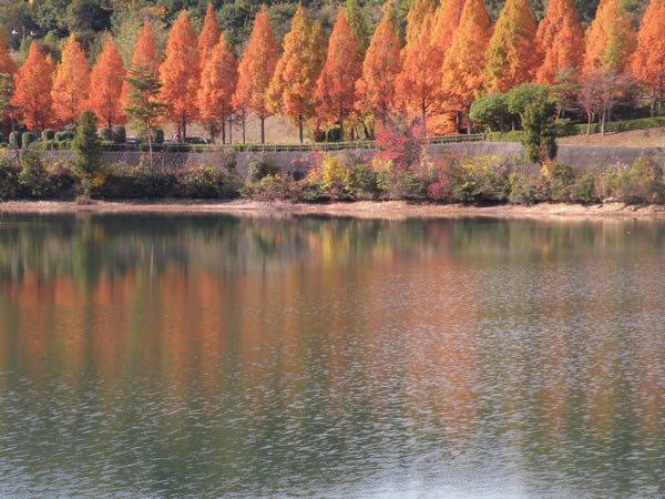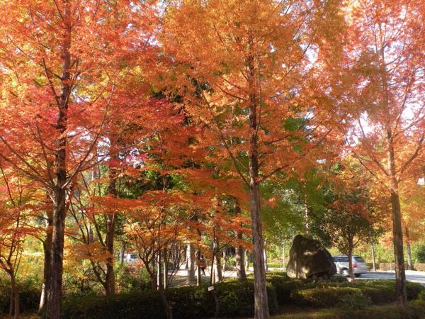 メタセコイアの秋色は、赤と黄色の中間なのがミソ。この木は、絶滅したと思われていたのが中国で再発見されというが、恐竜が絶滅したあとの新生代に繁栄した。メタセコイアの林に恐竜がうごめく空想は儚く消えた。