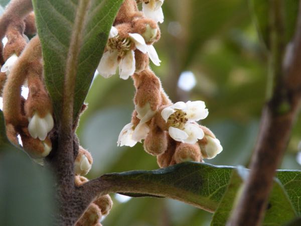 ビワの花が、冬に向かって咲き始めた。おもしろいことに、花茎や萼?が暖かそうな毛でびっしり覆われている。来春まで、これが『防寒具』として役立つのだろうか?