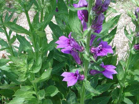 7月10日 のブログにベニバナサワギキョウをアップしました。今日の花は、その花の色を紅から紫に変えただけという感じです。そのほかはすべてそっくりで、強いて言えば、開花が1週間遅い。