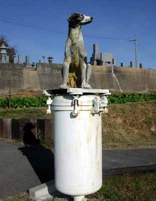 家に戻ってあれこれ考えたことは・・・道を挟んで大きい幼稚園があるので、白い円筒の下には汚水の浄化槽があるかもしれない。とすれば、円筒には排気ガスに含まれる悪臭を吸着する活性炭が詰められているかもしれない。活性炭を交換するための蓋が上部に付けられているが、園児などにイタズラされては困るので、「犬」を載せてしまった!