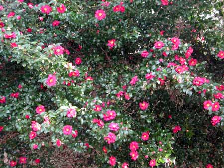 神社の近くに国立病院がある。その土手に大きな寒椿が別々に3本。寒椿は、成長が遅いものの、樹高4メートルくらいにはなるという。さらに同じくらい樹幅があれば、とても見事だとか。写真の寒椿はそこまでいかなかったが、ゆったりと枝を広げて咲いていた。花木に花のない季節、貴重な存在である。