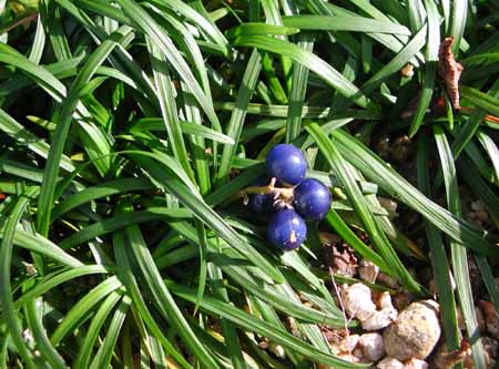 今朝、晴れ間が出て、斜めに射しこむ細い光にキラリと光るもの。玉竜の青い実だった。玉の大きさといい、光の反射の具合といい、真珠を連想してしまった。