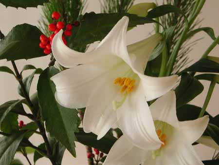 写真のユリは、5~10度の場所だったので、いっこうに咲かない。お正月も過ぎてからつぼみが伸びてきて、テッポウユリであることが分かる。2週間も経って幻想的な花姿へ。不思議な生命力です。色を添えるのはセンリョウの実。