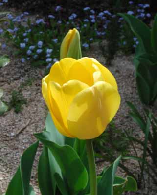 きのうのタンポポと黄色つながりで、黄色いチューリップをアップ。「暗闇」に潜むワスレナグサに助けてもらいながら・・