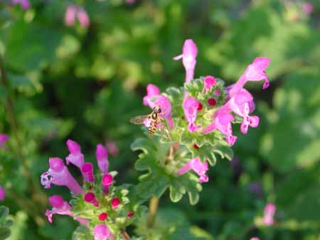 なにも植えられていない畑のあとに、栄養状態よろしく、ホトケノザがすくすくと育ってしまった。だから、1本、2本が咲くというのではなく、いっせに咲き上がっているのである。この機に乗じてハナアブの仲間が、採蜜に余念がない。