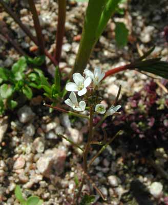 写真の植物は、根生葉が残り、種が花茎に沿って上向きに付いていることから、ミチタネツケバナではないかと思う。とても小さいので、バックのリナリアの茎が大木のよう。マルバコンロンソウらしき植物も別にあり、その区別に戸惑うことしばし。