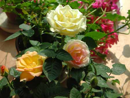 葉に巻いたラベルには、「コーネリア」とある。だから、このバラを1種類、寄せ植えにしたと思いこんでいた。しかし色に違いがありすぎる。調べてみると、コーネリアはピンクのバラ!すると他のバラの名前はなに?それは未だにわからない。
