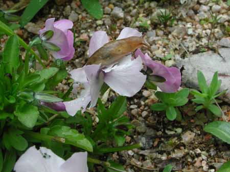 それにしてもうちのナメクジは、同じビオラでも白っぽいビオラがお好みなのだろうか。青紫やオレンジ、エンジの花は、被害がはるかに少ない。そして野生のスミレも食べられたように見えない。