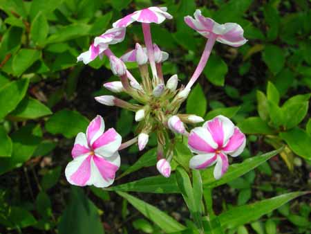 探索の気持ちを込めて、昨秋、宿根フロックス・ナターシャを植えてみた。それが少し前から咲いている(写真)。直立した背丈は、仲間のクサキョウチクトウ(オイランソウ)に比べ、半分くらいしかない。全体にきゃしゃで、紅白複色の花が可愛い。