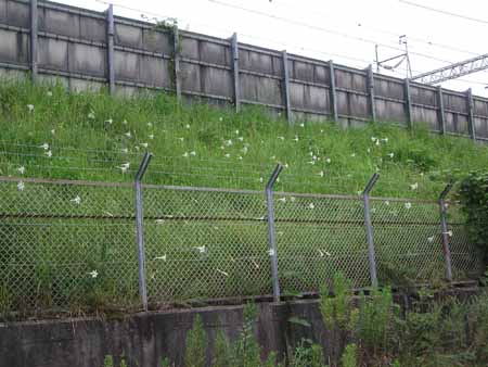 今年は面白い場所に生えているタカサゴユリを発見した。それは新幹線ののり面。駅に至近だけれど、防音壁があるからそちらからは見えない。有刺鉄線の付いたフェンス越しに見上げるのみ。人からは完璧に隔離されている。