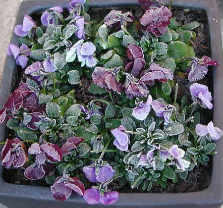 ここまで寒くなると、ビオラは頭を下げるだけでなく、花びらの上の霜の生長が著しい。花びらの縁に長いヒゲがいっぱい。オオ、寒!