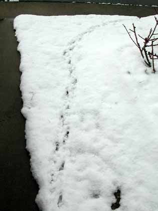 確認のため外に出てみた。カラスの通った跡が直線状に。まるで「お化粧」を施したように、踏み跡がぼかされている。わざわざ雪の上を通っていることからして、やっぱり遊んでいたのか!!