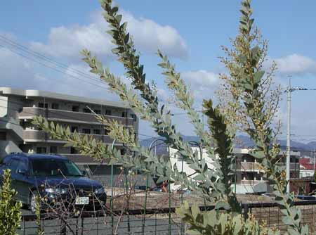 生長した花序はミモザに似るものの、葉が単葉で異なる。太めの枝に互生(たまに対生に見えるものもある)している。葉の形は全縁で、銀白色を帯びる。