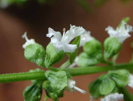 3月12日 に取りあげた、秋蒔き、室内育ちのバジル。そのとき花のことは誉めなかったけれど、陽気がよくなり、外の風にも触れさせた今日この頃、白い花がめっきり可愛らしくなった。