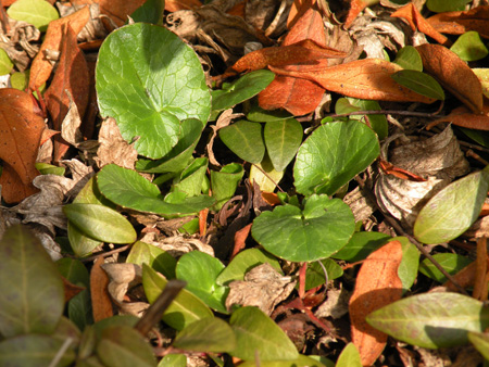 木の下に頭を突っ込むと、ヒメリュウキンカの丸い葉が緑鮮やか。落ち葉の間から顔を覗かせている。そこへ割り込んだ、丸みを帯びた細長い葉は、ヒメツルニチニチソウ。例年より生長が早いかと思ったけど、去年の写真と同じようなものだった。