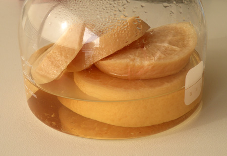 柑橘類の場合、皮をどうするかに悩む。皮には個性ある香りがあるので、皮を一緒に漬けこむのが筋と思うものの、レモンの例では、快いレモン香とは別に、生食では隠されていた匂いに悩まされた。その匂いは「デコポン」にも存在するようだが、弱い。