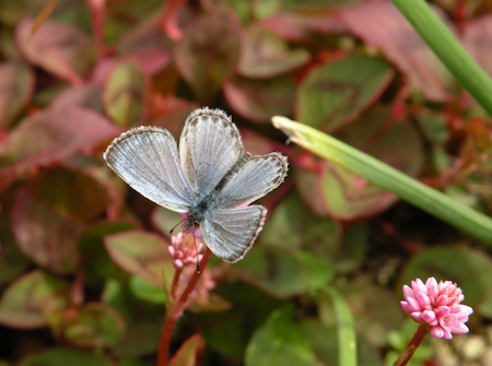 シジミチョウは、うちの庭でずっと舞っている。一昨日にアップしたジョロウグモに捕らえられるものもいる。写真のチョウは、たぶんヤマトシジミ。気のせいか、鱗粉がはげ落ちているように見える。