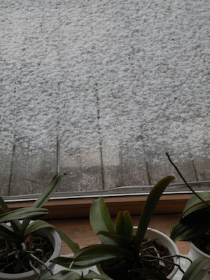 写真は今朝のものでなく、-10℃近くなったときのもの。コチョウランがそれを眺めているというのは擬人的表現。