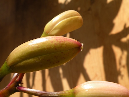 ただ、つぼみの先端と各花柄の根元に付く、小さい「蜜」の粒は例年どおり(当たり前か)。
