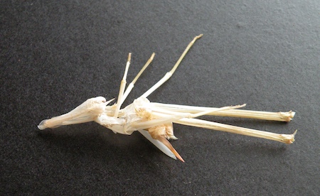 あるブログの言うように、脱皮後、抜け殻が自身のタンパク質源として食べられてしまうのなら、抜け殻を拾ったのは幸運だったのだろう。いっぽうショウリョウバッタの脱皮は、「上半身」と「下半身」の2段階だそうで、写真の殻の観察では、いずれも背中から始まるように思える。(下半身の脱皮の連続写真は こちら
