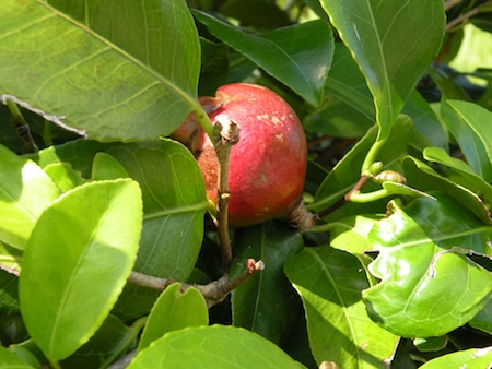 ツバキはツバキでも小形のリンゴほどの大きい果実が、赤くつややかなのは魅力的。ただしリンゴのように美味しい果肉に覆われているのではなく、種子は厚手の固い果皮に守られている。