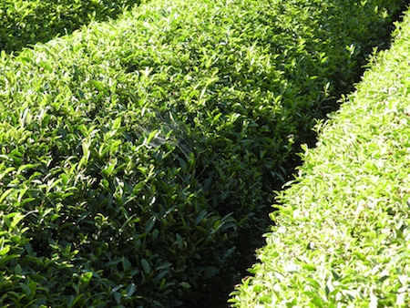 さて、好天の下、自転車で家を出て、遠く山道を上っていったら(最後の方は自転車を押して)、こぢんまりとした茶畑があった。写真でよく見るように丸く刈り込まれていた。家から約15km、標高は320mほど(うちとは標高差100m)。