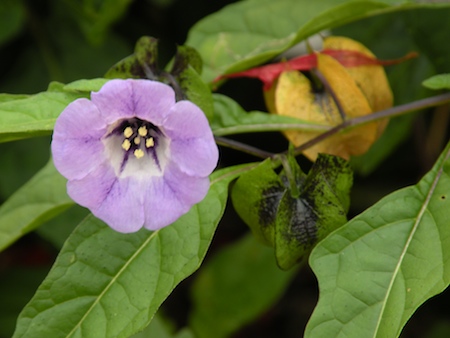 紫色の花の右にあるのは、薄汚れた感じに熟した果実。果実の上部に付く赤色は、サルビアの脱落した花弁であって、この植物のものではない。